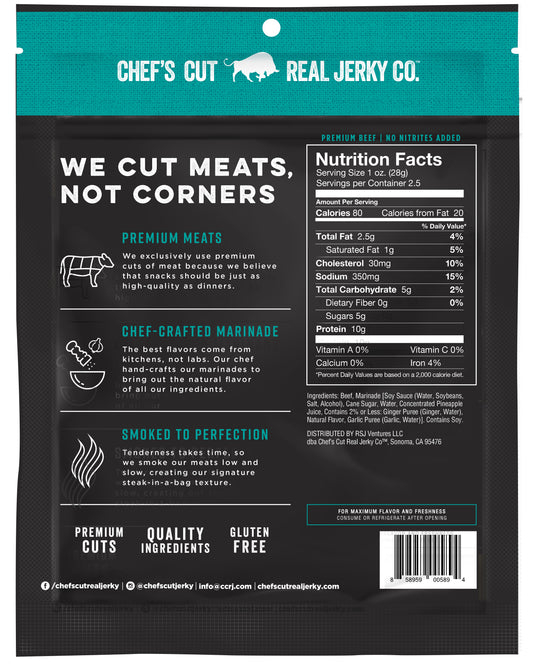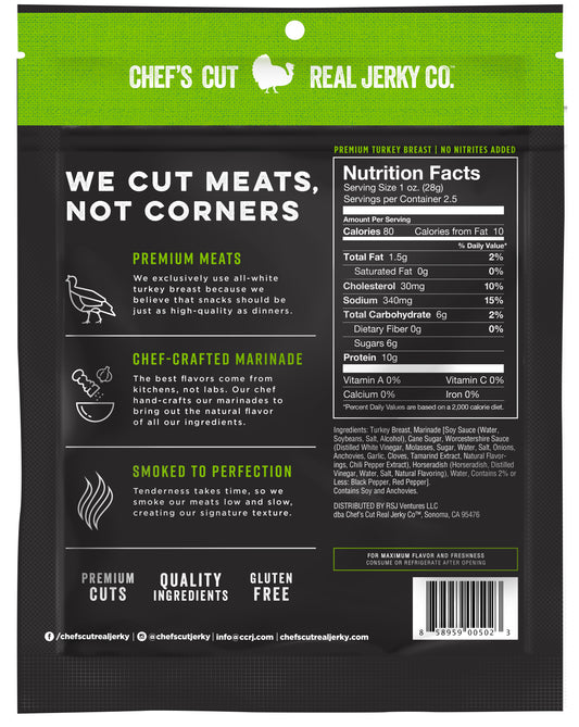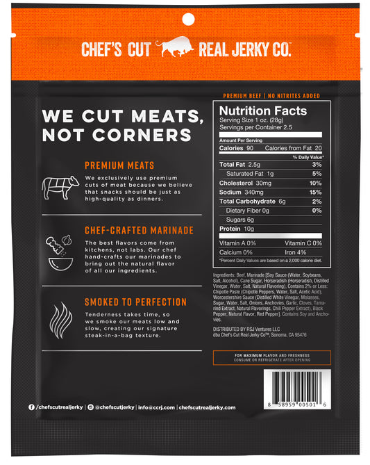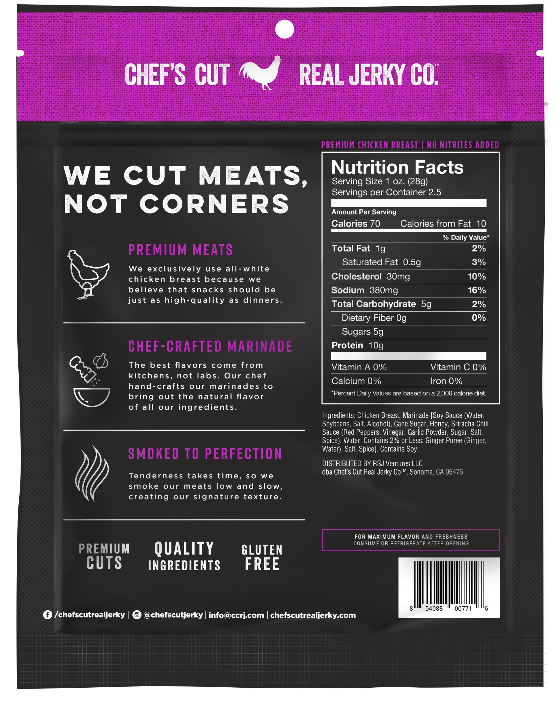 Each bag of Chef's Cut Real Jerky Co™ chicken jerky is made exclusively with 100% all-white chicken breast meat. We take chef crafted marinades composed of only the finest real ingredients to create a truly tender, premium chicken jerky.