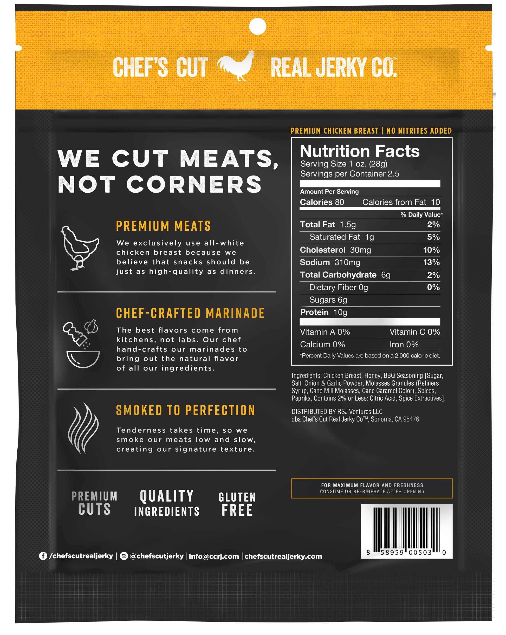 Whether it's your schedule or the weather, grilling chicken isn't always a possibility. With our Honey Barbecue chicken jerky, you get the sweet and smoky taste of a summer day on the grill - without any of the hassle.