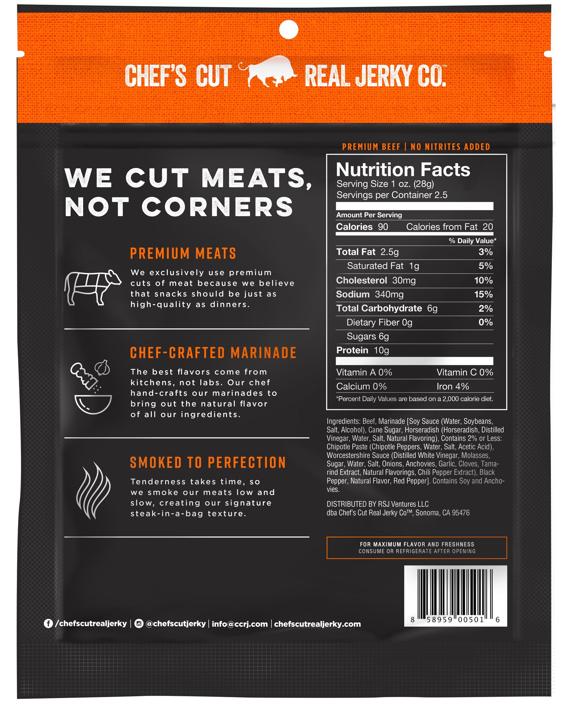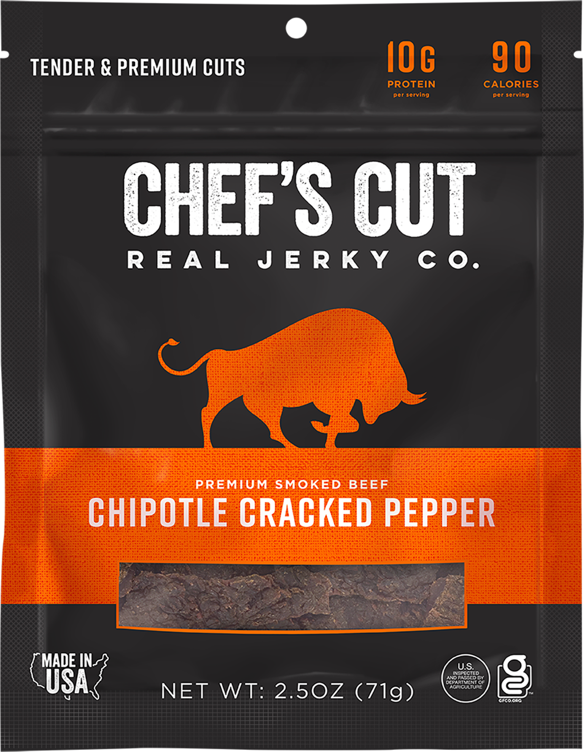 Chef's Cut Real Jerky Co™ is redefining what beef jerky looks, tastes, and feels like. By using premium cuts of top-round sirloin with real ingredients and chef-crafted marinades, we create a product that's incredibly tender and flavorful. It's not just beef jerky - it's steak in a bag.